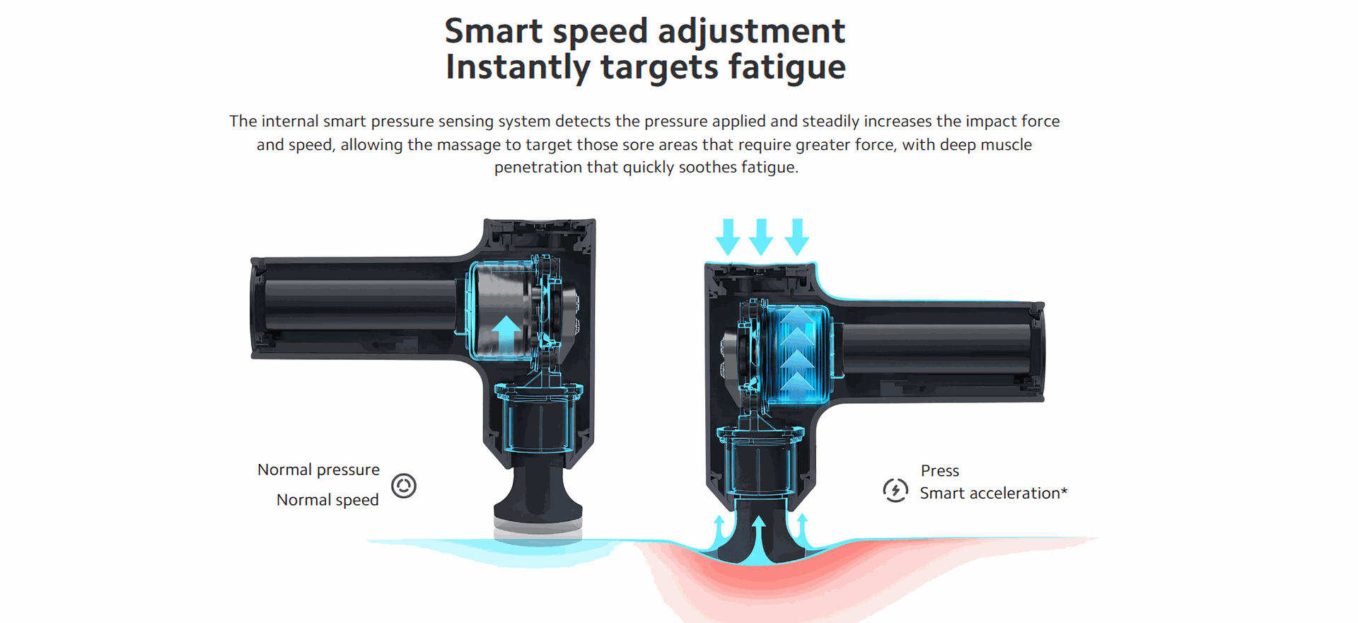 In low-speed mode, applying pressure to the muscle automatically increases speed, delivering a deeper massage as needed. Smart tech, smarter recovery.